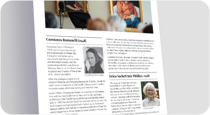 Amidst all her own pursuits, Costanza remained a steadfast rock Constanza Romanelli (1948) and a guiding light for her elder brother Raffaello and her sister Ilaria, who married the Frenchman Arnaud Faure. Not having Constanza, born in Florence in children of her own, she embraced her role as a second mother 1928, was of impressive lineage to Ilaria’s five children, Bettino’s children and grandchildren, and a descendant of William the offering love and support. Conqueror. Her father was a Costanza Romanelli, Baroness Ricasoli Firidolfi, leaves a legacy decorated Italian Navy Commander woven with threads of faith, classical culture gleaned at and renowned sculptor, and her Somerville, compassion, and devotion to family. Her memory maternal grandfather was Dean of will endure in the hearts of all who were touched by her Gibraltar, Master of the Charterhouse generosity, friendship, humour and unwavering spirit. in London and Chaplain of the Order of St. John of Jerusalem. CONSTANZA ROMANELLI Helen Sackett (née Phillips, 1948) After the prestigious Sacro Cuore school in Florence, and following the tumult of WW2, she left to read Literae Humaniores at Somerville College, where she liked The daughter of teachers in Bristol, to smoke a pipe, whilst also nursing with the Red Cross. Helen Phillips studied Physics at Somerville just after WW2. At Oxford In the 1950s, Costanza embarked on a number of adventures, she met her future husband, Edmund first with her Somerville friend, Patricia Drinkall, journeying Sackett, at the John Wesley Society to Morocco, then travelling around Kenya and Somalia, where and was impressed with him because later in 1965 her mother would be murdered whilst running the he had been in the army in Palestine local hospital she had founded with Catholic nuns. Costanza’s and had experience of the world. devout Catholic faith led her to become a member of Opus Dei Before they married, Helen trained as which helped her fulfil her desire to foster Christian life and the a teacher at Hugh’s Hall in Cambridge HELEN SACKETT Church’s evangelizing mission. followed by a time teaching in In 1979, she married the son of Florence’s oldest noble family, Worthing and then in Stroud. She soon became the mother of Baron Bettino Ricasoli Firidolfi, and she embraced her role her first son. as guardian of the Castello di Brolio in Tuscany, the seat of Deciding that teaching wasn’t for him, Edmund became librarian the Ricasoli family since 1141. Here their friends and other of Westminster College in Oxford, and the family moved to live illustrious figures from around the world, including the then in Bayworth, between Oxford and Abingdon. They attended Prince Charles, were welcomed with her signature grace and All Saints Church, Abingdon, where Helen sang in the choir. hospitality and fed in an immense frescoed dining hall. Among Very soon after that a second son was born, and she stayed at her circle of English friends, the Florence-based aesthete and home to look after the two boys. After they had started school, scholar Sir Harold Acton found a regular place, often joining her she went taught for a short time at Abingdon school and then for tea in her home at Piazza di Bellosguardo where poets and at Saint Helen and Saint Katherine nearby, where she finally artists of the time gathered in spirited conversation. became Head of the Physics Department. Some of the girls 53