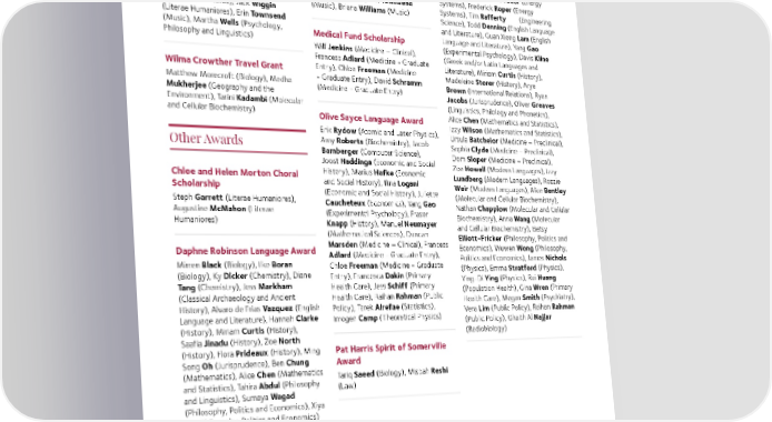 Languages), Rozzie Weir (Modern John M Cockcroft Choral Sports and Wellbeing Award Languages), Holly Cobb (Modern Scholarship Philippa Rolfe (Biology), Catherine Languages and Linguistics) François de Robert Hautequere Stephenson (Biology), Yu Ming Lee (Music) (Classical Archaeology and Ancient Rita Bradshaw Travel Grant History), Mei Whattam (Classical Archaeology and Ancient History), Ning Mei Whattam (Classical Archaeology Margaret Irene Seymour Music Zhang (Computational Discovery), Ramiz and Ancient History), Sam Broadhurst Award Razzak (Economics), Kyle Kass (Energy (Engineering Science), Oscar Brant George Whittle (Engineering Science), Systems), Pauline Marc Tudor (Energy (Literae Humaniores), Hattie Clayton Eliam Lau (Music), Erin Townsend Systems), Frederick Roper (Energy (Literae Humaniores), Shaan Sidhu (Music), Briana Williams (Music) Systems), Tim Rafferty (Engineering (Literae Humaniores), Jack Wiggin Science), Todd Denning (English Language (Literae Humaniores), Erin Townsend and Literature), Guan Xiong Lam (English (Music), Martha Wells (Psychology, Medical Fund Scholarship Language and Literature), Yang Gao Philosophy and Linguistics) Wilf Jenkins (Medicine – Clinical), (Experimental Psychology), Davis Kline Francess Adlard (Medicine - Graduate (Greek and/or Latin Languages and Wilma Crowther Travel Grant Entry), Chloe Freeman (Medicine Literature), Miriam Curtis (History), - Graduate Entry), David Schramm Madeleine Storer (History), Arye Matthew Morecroft (Biology), Medha (Medicine - Graduate Entry) Brown (International Relations), Ryan Mukherjee (Geography and the Jacobs (Jurisprudence), Oliver Greaves Environment), Tarini Kadambi (Molecular (Linguistics, Philology and Phonetics), and Cellular Biochemistry) Olive Sayce Language Award Alice Chen (Mathematics and Statistics), Erik Rydow (Atomic and Laser Physics), Izzy Wilson (Mathematics and Statistics), Amy Roberts (Biochemistry), Jacob Ursula Batchelor (Medicine – Preclinical), Other Awards Bamberger (Computer Science), Sophia Clyde (Medicine – Preclinical), Joost Haddinga (Economic and Social Dom Sloper (Medicine – Preclinical), History), Marius Hafke (Economic Zoe Howell (Modern Languages), Izzy Chloe and Helen Morton Choral and Social History), Ilina Logani Lundberg (Modern Languages), Rozzie Scholarship (Economic and Social History), Juliette Weir (Modern Languages), Alice Bentley Steph Garrett (Literae Humaniores), Caucheteux (Economics), Yang Gao (Molecular and Cellular Biochemistry), Augustine McMahon (Literae (Experimental Psychology), Fraser Nathan Chapplow (Molecular and Cellular Humaniores) Knapp (History), Manuel Neumayer Biochemistry), Anna Wang (Molecular (Mathematical Sciences), Duncan and Cellular Biochemistry), Betsy Marsden (Medicine – Clinical), Francess Elliott-Fricker (Philosophy, Politics and Daphne Robinson Language Award Adlard (Medicine - Graduate Entry), Economics), Wuwen Wong (Philosophy, Mirren Black (Biology), Ilke Boran Chloe Freeman (Medicine - Graduate Politics and Economics), James Nichols (Biology), Ky Dicker (Chemistry), Diane Entry), Francesca Dakin (Primary (Physics), Emma Stratford (Physics), Tang (Chemistry), Jess Markham Health Care), Jess Schiff (Primary Ying-Di Ying (Physics), Rui Huang (Classical Archaeology and Ancient Health Care), Raihan Rahman (Public (Population Health), Gina Wren (Primary History), Alvaro de Frias Vazquez (English Policy), Tarek Alrefae (Statistics), Health Care), Megan Smith (Psychiatry), Language and Literature), Hannah Clarke Imogen Camp (Theoretical Physics) Vera Lim (Public Policy), Raihan Rahman (History), Miriam Curtis (History), (Public Policy), Ghaith Al Najjar Saafia Jinadu (History), Zoe North (Radiobiology) (History), Flora Prideaux (History), Ming Pat Harris Spirit of Somerville Song Oh (Jurisprudence), Ben Chung Award (Mathematics), Alice Chen (Mathematics Tariq Saeed (Biology), Misbah Reshi and Statistics), Tahira Abdul (Philosophy (Law) and Linguistics), Sumaya Wagad (Philosophy, Politics and Economics), Xiya Yu (Philosophy, Politics and Economics) 65
