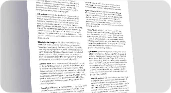Junior Research Fellows’ Activities As always, a particularly vibrant part of the Somerville College Community is our collection of Junior Research Fellows, who are pursuing postdoctoral research in a huge range of topics. The following report attempts to summarise some of this fascinating work. Maria Caiazza works in the Department of Physiology, has developed an AI model based on our understanding of Anatomy and Genetics, using stem cell models of Parkinson’s the human/primate relational reasoning which successfully disease to understand how calcium behaves inside cells since accounted for the results in a new eye-tracking experiment. calcium is central to cell function. Maria is working with AstraZeneca to find treatments that can help nerve cells in Björn Vahsen works in the Nuffield Department of Clinical Parkinson’s patients function normally again. Neurosciences. Björn models Motor Neurone Disease (MND) in a dish using human stem cells. In particular, Björn has been Andrea Kusec works in the Translational Neuropsychology studying the role of brain immune cells, microglia, in the group in the Nuffield Department of Clinical Neurosciences. commonest genetic form of MND. Amongst other awards, Andrea’s research focuses on developing accessible mental Björn received the Felgenhauer Research Award 2023 for health interventions for adults with various types of brain young Neuroscientists from the German Neurological Society injury, such as stroke, trauma or brain tumours. A recent in November 2023. paper from Andrea and her team showed that standard ‘talking therapy’ for depression can be less effective with brain injury George Ward is our Mary Ewart Junior Research Fellow. patients because of the impact of the injury on memory and George is an economist. His work focuses on worker and attention. The paper went on to show that adjustment to the workplace wellbeing, including measures of job satisfaction, standard therapy could significantly improve the outcomes for happiness, stress, and purpose/meaning. George is writing these patients. a book, co-authored with Jan-Emmanuel De Neve, entitled Why Workplace Wellbeing Matters, which will be published by Elizabeth MacGregor is our Joanna Randall MacIver JRF, Harvard Business Review Press in the Spring of 2025. George working in Music Education. Elizabeth is pursuing a project also studies the impact of negative emotions on shaping focusing on how the way that music is taught in schools can populist beliefs and voting intentions. have long-lasting impacts on students. These impacts can be highly detrimental if the student’s experience is characterised Sylvia Zanoli is a theoretical physicist working in the field of by experiences of failure, disappointment and exclusion in collider phenomenology. The main goal of Sylvia’s research is the music classroom. Elizabeth is hoping to develop a music improving the accuracy of theoretical predictions of particle pedagogy that is sensitive to this music vulnerability. interactions at the Large Hadron Collider (LHC) in order to obtain cutting-edge results that can be directly compared to Amanda Rojek works in the Pandemic Sciences Institute, part data. In the next few years, the LHC will undergo a substantial of the Nuffield Department of Medicine. Amanda’s work aims improvement, which will lead to experimental data with an to improve the agility of the clinical science response during unprecedented level of precision. Correctly interpreting the disease outbreaks to improve patient survival and public health upcoming data will be possible only if precise and realistic responses. Amanda has studied diseases such as Ebola, Nipah theoretical predictions are available. Sylvia is working to help Virus Disease, and Monkeypox. In particular, Amanda is leading provide those predictions. work to implement the first global harmonised trial for Ebola treatments across twelve countries in Africa with the World Rocco Zizzamia works in the Economics Department. Rocco Health Organisation. is using experimental methods to test the effectiveness of various innovative economic or behavioural interventions Emma Soneson works in the Department of Psychiatry, in the around the world. One project aims to test whether it is more section focusing on Child and Adolescent Psychiatry. Emma efficient and effective to provide anticipatory support for focuses on ways to try to reduce the incidence, prevalence people in disaster-prone areas rather than rely on emergency and impact of child and adolescent mental health difficulties. relief (often in kind rather than cash) after a disaster occurs. Emma is especially interested in public health approaches, the Rocco’s team is studying the impact of anticipatory cash intersections between education and mental health, and ways transfers in the Jamuna River Basin in Bangladesh, where in which we can support schools to take a central role in mental flooding is likely to occur in the forthcoming monsoon season. health promotion and prevention. Rocco has also evaluated the impact of an unconditional cash transfer programme undertaken in response to severe flooding Jessica Thompson works in the Department of Experimental in Pakistan in 2022. Other projects relate to the impact of Psychology. Jessica is working on developing a formalism to repeated rejection on job searching in South Africa and Group develop computational theories of human cognition. Notably, Coaching projects in Bangladesh, Uganda and the Philippines. Jessica has been focusing on visual relational reasoning, which is the way the brain interprets visual information to draw conclusions about the relationships between objects. Jessica DR STEVE RAYNER, Senior Tutor 17