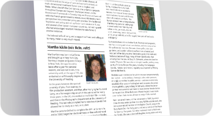 were able to say whether any of their care leavers left school Described by her colleagues at Pembroke as sympathetic with qualifications that might help them get a job. Helen and welcoming, they also noted that she was demanding was instrumental in changing that. Passionate about fighting of her students and ‘critical in the best sense of the word – the injustices faced by children whose life chances had been constructive and never dismissive or condescending’. compromised by poverty, abuse and other disadvantages, she She is warmly remembered by all those she supported as a had hands-on knowledge of the challenges facing children tutor, a colleague and a friend. in care and used her position to introduce policies to provide them with better protection, higher standards of care and more extensive opportunities to fulfil their potential. Ruth Lister (1944) Helen led the cross-government initiative to introduce specific, evidence-based programmes to improve the life chances of Born in London and educated at children in and on the edge of care and worked to introduce St Paul’s School for Girls, Ruth multi-dimensional treatment foster care to England and was Head Girl and an academic Wales. When she left the Civil Service, she undertook projects success. Her time at Somerville was throughout Europe and beyond. She helped introduce the overshadowed by war and life was Assessment Framework in Canada, Italy and France and worked short of creature comforts. The with the French government to introduce a child development Bursar advised new undergraduates perspective into protection policy and practice. She facilitated that the only personal belongings legislation and policy and set up foster care services in Russia allowed were their ‘identity and and several other Eastern European countries, not resting until ration cards, gas mask, electric she had encouraged reluctant ministers to take forward torch, warm rug, butter dish with lid, RUTH LISTER another initiative. a 1lb jam jar with lid, a tin (for sugar), two pairs of bed socks The beloved wife of Jerry, and a supportive friend and colleague and a jerry.’ to many, Helen is very much missed. Such restrictions did not bother Ruth. Practical and pragmatic, she had a strong and robust constitution, and led a very active Martha Klein (née Bein, 1987) life well into her eighties. She was a keen golfer, skier and gardener; and a swim before breakfast in an unheated pool was part of her daily routine. She loved a good, brisk walk and Martha Klein was born in California had a succession of dogs, many of them dachshunds, that and brought up in New York City. accompanied her around Bury St. Edmunds, where she lived for Starting a degree at Queens College nearly 70 years. She was also an intrepid traveller, visiting many in New York, she was forced to parts of the world over the years, including the Galapagos leave after a year for personal Islands, Pakistan and Yemen, regularly accompanied by lifelong reasons, and was not to return to Somerville friends. university until, at the age of 33, she embarked on a Philosophy degree at Medicine was a profession for which she was temperamentally the University of Reading. well suited – conscientious, thorough, calm under pressure, MARTHA KLEIN strongly committed to public service – and one in which she In the years between she worked excelled. After posts in Nottingham and Leicester, she joined a variety of jobs, from waitress to the Angel Hill surgery in Bury St Edmunds, where the senior film production assistant, and then, after marrying her husband partner was a woman and keen to have another female doctor Larry, on a Norwegian ship on which the pair sailed for nearly in the practice. When Ruth was offered the job, it was made three years. In the UK, she worked at the British Film Institute clear to her that she would have to resign if she married. and then in the Photographic Department at the University of Reading. This last role prompted her to take two A Levels that Ruth remained there until her retirement in 1991, by which allowed her to study as a mature student. time she was senior partner. In a very full life outside work, she Martha came to Oxford to complete the BPhil at Somerville, was a committed member of the Baptist Church, sang in the and in 1980 began her doctoral thesis on free will and moral Bury Bach Choir for forty years, and was a Justice of the Peace responsibility. In the same year she began to teach at Reading for twenty-five years. But what mattered most to Ruth was and a number of Oxford colleges. Seven years later, on her family. She was a devoted daughter, loving sister and very receipt of her doctorate, she was appointed to a lectureship generous aunt and great-aunt. in Philosophy at Christ Church. In 1993 Martha was elected She also retained a lifelong connection with Somerville Fellow of Philosophy at Pembroke. Here, she continued to focus and when her great-nephew followed in her footsteps and her research on philosophy of mind, specialising in free will, matriculated at the college in 2007, she was very pleased to moral responsibility and the relationship between thoughts visit him and have the chance to see her old room in Penrose. and actions. She was particularly interested in the intersection Although so many years had passed, she was still able to recall of philosophy of mind and moral philosophy. Martha is in vivid detail arriving on her first day with the few possessions remembered for teaching and encouraging generations of permitted, eagerly anticipating everything ahead. The fact that Philosophy students. The great fondness and respect with her memories were still so clear 60 years on reflects the lasting which she was regarded by her students was clear. impact the college made on her life. 49