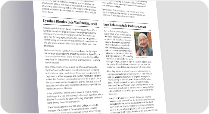 As, in addition to these, Chairman of Trustees at the Arnitt a tough crowd, but well within her skills. She did some more Museum in Ambleside, primary school governor and governor learning herself, learning silversmithing and befriending a lady at her own former school in Windermere, Vivienne’s BEM in called Margaret Rhodes, whose son, Brian, she soon met and the 2020 New Year’s Honours list, for services to her local married. community, was very well deserved. Membership of further From here Cynthea adopted and helped raise Brian’s three groups, fundraising for charities from the National Asthma children, alongside lecturing in Art History, for over 30 years, Campaign to the Royal Shakespeare Company, and being for the Workers’ Educational Association. From the 1980s mother to two children (grandmother to three, and great- she began to organise group trips to cities in Europe to tour grandmother to two), make it impossible to see how she could museums and galleries, and travelled widely herself. Returning have time for reading, scrabble and going to the theatre! to Manchester University to study Art History formally, she Vivienne’s sense of the importance of education stayed with wrote an MPhil thesis on early vernacular Italian poetry and her and her years in schools showed her as a brilliant teacher how artists illustrated it. who inspired others. She made a huge contribution to the lives Spending her final years in the Lake District, after Brian’s of so many others throughout her life, and shared her positive death, she enjoyed the company of her Burmese cats and outlook with them. As her daughter comments: ‘Mum had joy welcomed friends from all parts of her life. in her heart’. Cynthea Rhodes (née Wo昀昀enden, 1956) Jane Robinson (née Packham, 1959) Brought up in Edinburgh during the privations of World War 2, Born in Boston, Massachusetts, Cynthea moved to Parbold in Lancashire and bloomed at the during WW2, a few months before nearby girls’ grammar, becoming Head Girl. She showed an her father was killed in the Atlantic early flair for languages, consolidated by an exchange with a as part of the Royal Navy Volunteer French family with whom she stayed in touch throughout her Reserve, Jane Hippisley Packham life. She won a state scholarship to Somerville to read French returned to Bath as a small child. and Italian. She attended several schools in Before coming up, Cynthea’s French exchange family helped quick succession before settling as her arrange to spend some time at the Sorbonne. Aged 19, she a boarder at Badminton School and then engaged on a solo trip to Italy and it was the start of her thriving academically. After reading JANE ROBINSON deep love for that country to which she would return regularly Chemistry at Somerville, she went for six decades. to King’s College, London, to train as a science teacher. Soon she married Roger Robinson, a paediatrician, and after the One of the most defining eras of her life was at Somerville. couple had three children, Jane became a full-time mother. Cynthea’s work ethic meant a lot of work and less socialising After they settled at school, Jane returned to teaching, at in the intense eight-week terms. There was no concession for Burlington Danes School in Hammersmith. In 1991 she was beginners in either language, and she had not studied Italian at ordained Deacon in the Church of England, serving at St school. Her first term was reading Dante in the original. One of Peter’s, Ealing, St Gabriel’s, North Acton, and St Barnabas, her tutors was married to a painter and the free availability of Ealing. Though a staunch supporter of women priests, lectures sparked an early interest in art history, especially the when the Church of England began ordaining women to the Renaissance era in Florence. priesthood Jane elected to remain a deacon, feeling that her In her spare time, she became involved in theatre, mostly calling had been to the ministry of service particular to the backstage. She told of obtaining fresh sheep’s eyes from a local diaconate. butcher for use in King Lear and Dudley Moore and Ken Loach Her gift of £1,000 to St Gabriel’s, Acton, was originally were among those she worked with. intended to be in her will, but she decided to give the money There followed time in the BBC after College, as a studio during her lifetime, so that she could see what the church manager of a number of famous programmes including spent it on! Her donation helped to fund the purchase of a Desert Island Discs and Housewives’ Choice. When Princess work of art, namely a religious triptych by the celebrated Margaret got married in 1960 Cynthea was at Westminster iconographer Cristi Paslaru. Installed as the altar piece in a side Abbey acting as the liaison between the BBC and the Italian chapel, it is a beautiful way to remember her. broadcasting organization. Jane was widowed in 2003. After nearly 60 years living in Two years later, she decided on a change of direction and Ealing, in 2021 she moved to Lewes, East Sussex, close to returned to Oxford to take a diploma in education. She took a where her father’s family had been from. She died after a job at Stockport College as a lecturer mostly to apprentices on short illness in November 2023, survived by her 3 children, 5 day release and learning about current affairs, history and art: grandchildren and 4 great grandchildren. 52