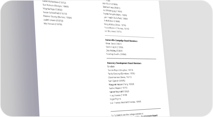Distinguished Somerville Development Friends of Somerville Board Members Elizabeth Bingham (Loxley, 1957) Co-Chair Kay Brock (Stewart Sandeman, 1972) Sybella Stanley (1979) Ginny Covell (Hardman Lea, 1973) Co-Chair Charlotte Morgan (1969) Ayla Busch (1989) Karen Richardson (1972) Basma Alireza (1991) Sue Robson (Bodger, 1966) Judith Buttigieg (1988) Virginia Ross (1966) Sophie Forsyth (Wallis, 1989) Susan Scholefield (1973) Lynn Haight (Schofield, 1966) Eleanor Sturdy (Burton, 1984) Niels Kröner (1996) Judith Unwin (1973) Vicky Maltby (Elton, 1974) Mai Yamani (1979) Nicola Ralston (Thomas, 1974) Judith Unwin (1973) Somerville Campaign Board Members Omar Davis (1997) Emma Haight (1999) Dan Mobley (1994) Sundeep Sandhu (1994) Honorary Development Board Members Tom Bolt Doreen Boyce (Vaughan, 1953) Paddy Crossley (Earnshaw, 1956) Clara Freeman (Jones, 1971) Sam Gyimah (1995) Margaret Kenyon (Parry, 1959) Nadine Majaro (1975) Harriet Maunsell (1962) Hilary Newiss (1974) Roger Pilgrim Sian Thomas Marshall (Thomas, 1989) For full details see the college website at www.some.ox.ac.uk/alumni/the-development-board 72