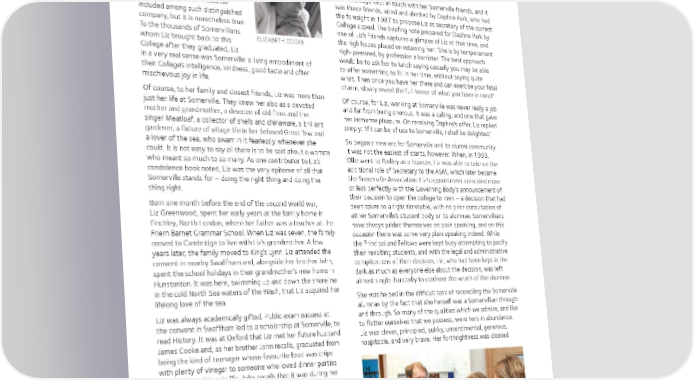 Liz’s choice of circuit may have been determined by the fact Elizabeth (Liz) Cooke that she had by this time married James, and bought a small (née Greenwood, 1964) house in Charlbury. A decade later, in 1979, they found Tulip Tree House in Great Tew, in need of the care and attention which it would receive in abundance over the next forty-five There are some people whose years. When their son Oliver (Ollie) was born the following year, name alone evokes the idea of Liz decided to leave the Bar and devote herself to her son, her Somerville – women like Emily house and her garden. This decision was to have far-reaching Penrose, Dorothy Hodgkin and consequences for Somerville. Janet Vaughan. Our dear friend Liz had always kept in touch with her Somerville friends, and it Liz Cooke would have hated the was those friends, aided and abetted by Daphne Park, who had suggestion that she should be the foresight in 1987 to propose Liz as secretary of the current included among such distinguished College appeal. The briefing note prepared for Daphne Park by company, but it is nonetheless true. one of Liz’s friends captures a glimpse of Liz at that time, and To the thousands of Somervillians the high hopes placed on retaining her: ‘She is by temperament whom Liz brought back to this ELIZABETH COOKE high-powered, by profession a barrister. The best approach College after they graduated, Liz would be to ask her to lunch saying casually you may be able in a very real sense was Somerville: a living embodiment of to offer something to fill in her time, without saying quite their College’s intelligence, kindness, good taste and often what. Then once you have her there and can exercise your fatal mischievous joy in life. charm, slowly reveal the full horror of what you have in mind!’ Of course, to her family and closest friends, Liz was more than Of course, for Liz, working at Somerville was never really a job just her life at Somerville. They knew her also as a devoted and far from being onerous. It was a calling, and one that gave mother and grandmother, a devotee of old films and the her immense pleasure. On receiving Daphne’s offer, Liz replied singer Meatloaf, a collector of shells and chinaware, a brilliant simply: ‘If I can be of use to Somerville, I shall be delighted.’ gardener, a fixture of village life in her beloved Great Tew and a lover of the sea, who swam in it fearlessly whenever she So began a new era for Somerville and its alumni community. could. It is not easy to say all there is to be said about a woman It was not the easiest of starts, however. When, in 1993, who meant so much to so many. As one contributor to Liz’s Ollie went to Radley as a boarder, Liz was able to take on the condolence book noted, Liz was the very epitome of all that additional role of Secretary to the ASM, which later became Somerville stands for – doing the right thing and doing the the Somerville Association. Liz’s appointment coincided more thing right. or less perfectly with the Governing Body’s announcement of their decision to open the college to men – a decision that had Born one month before the end of the second world war, been taken to a tight timetable, with no prior consultation of Liz Greenwood, spent her early years at the family home in either Somerville’s student body or its alumnae. Somervillians Finchley, North London, where her father was a teacher at the have always prided themselves on plain speaking, and on this Friern Barnet Grammar School. When Liz was seven, the family occasion there was some very plain speaking indeed. While moved to Cambridge to live with Liz’s grandmother. A few the Principal and Fellows were kept busy attempting to pacify years later, the family moved to King’s Lynn. Liz attended the their revolting students, and with the legal and administrative convent in nearby Swaffham and, alongside her brother John, complications of their decision, Liz, who had been kept in the spent the school holidays in their grandmother’s new home in dark as much as everyone else about the decision, was left Hunstanton. It was here, swimming up and down the shoreline almost single-handedly to confront the wrath of the alumnae. in the cold North Sea waters of the Wash, that Liz acquired her She was helped in the difficult task of reconciling the Somerville lifelong love of the sea. alumnae by the fact that she herself was a Somervillian through Liz was always academically gifted. Public exam success at and through. So many of the qualities which we admire, and like the convent in Swaffham led to a scholarship at Somerville, to to flatter ourselves that we possess, were hers in abundance. read History. It was at Oxford that Liz met her future husband Liz was clever, principled, quirky, unsentimental, generous, James Cooke and, as her brother John recalls, graduated from hospitable, and very brave. Her forthrightness was cloaked being the kind of teenager whose favourite food was chips with plenty of vinegar to someone who loved dinner parties and the finer things in life. John recalls that it was during her student days at Somerville that he first saw the woman she would ultimately become: glamorous, impossibly sophisticated, and completely at home in the place she loved for the rest of her days. Upon graduating, Liz left Oxford for London. She had decided to become a lawyer and was admitted to the Middle Temple in 1966, supported by a reference from Barbara Craig who noted her ‘sense of irony and humanity’. In London she lived in an elegant flat in West Kensington and was called to the Bar in 1969. She joined the Chambers at 1 King’s Bench Walk, (L-R) SHIRLEY WILLIAMS MP, DR FRANK PROCHASKA, LIZ AND deciding to practise as a criminal lawyer on the Midland Circuit. CO-SECRETARY OF THE SOMERVILLE ASSOCIATION, LISA GYGAX 40