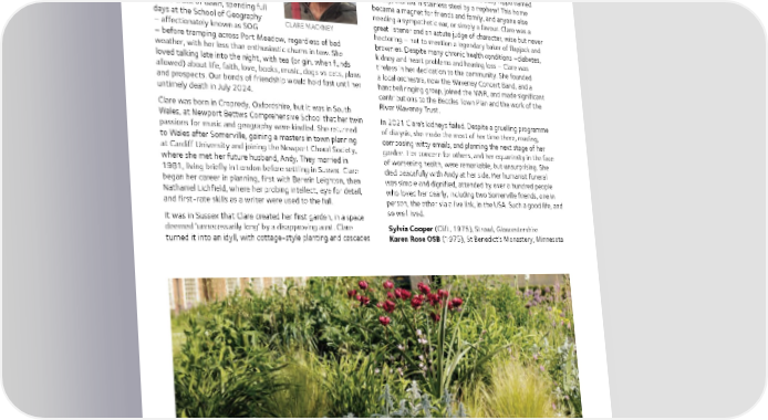 of roses. A move to the Midlands opened up fresh musical Clare Mackney (née Humphreys, 1975) opportunities. She took a degree at the Royal Birmingham Conservatoire, joined the National Saxophone Choir of Great When Clare came up to Somerville Britain, taught flute and sax at Lichfield Cathedral School and to read Geography, it became enjoyed reviewing for the Birmingham Post. quickly apparent that she was not It was, however, the final move to Suffolk in 2009, which one to follow the herd, drinking brought Clare the greatest satisfaction. Her house in Beccles lapsang souchong rather than PG was soon filled with colour and light, books and pictures, Tips and eschewing Led Zeppelin ceramics and rugs – and even a life-size baby hippo named for Ella and Louis. With a work Felicity, crafted in stainless steel by a nephew! This home ethic second to none, she was up became a magnet for friends and family, and anyone else at the crack of dawn, spending full needing a sympathetic ear, or simply a favour. Clare was a days at the School of Geography CLARE MACKNEY great listener and an astute judge of character, wise but never – affectionately known as SOG hectoring – not to mention a legendary baker of flapjack and – before tramping across Port Meadow, regardless of bad brownies. Despite many chronic health conditions –diabetes, weather, with her less than enthusiastic chums in tow. She kidney and heart problems and hearing loss – Clare was loved talking late into the night, with tea (or gin, when funds tireless in her dedication to the community. She founded allowed) about life, faith, love, books, music, dogs vs cats, plans a local orchestra, now the Waveney Concert Band, and a and prospects. Our bonds of friendship would hold fast until her handbell ringing group, joined the NWR, and made significant untimely death in July 2024. contributions to the Beccles Town Plan and the work of the Clare was born in Cropredy, Oxfordshire, but it was in South River Waveney Trust. Wales, at Newport Bettws Comprehensive School that her twin In 2021 Clare’s kidneys failed. Despite a gruelling programme passions for music and geography were kindled. She returned of dialysis, she made the most of her time there, reading, to Wales after Somerville, gaining a masters in town planning composing witty emails, and planning the next stage of her at Cardiff University and joining the Newport Choral Society, garden. Her concern for others, and her equanimity in the face where she met her future husband, Andy. They married in of worsening health, were remarkable, but unsurprising. She 1981, living briefly in London before settling in Sussex. Clare died peacefully with Andy at her side. Her humanist funeral began her career in planning, first with Berwin Leighton, then was simple and dignified, attended by over a hundred people Nathaniel Lichfield, where her probing intellect, eye for detail, who loved her dearly, including two Somerville friends, one in and first-rate skills as a writer were used to the full. person, the other via a live link, in the USA. Such a good life, and It was in Sussex that Clare created her first garden, in a space so well lived. deemed ‘unnecessarily long’ by a disapproving aunt. Clare Sylvia Cooper (Clift, 1975), Stroud, Gloucestershire turned it into an idyll, with cottage-style planting and cascades Karen Rose OSB (1975), St Benedict’s Monastery, Minnesota 50
