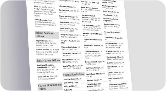 Jemima Tabeart, (MMath Marian Ellina Stamp Honorary Fellows Victoria Glendinning, CBE, Bath, MRes Imp/R'dg, PhD Dawkins, CBE, MA, DPhil, MA EPSRC R'dg), Mathematics FRS Kiri Jeanette Te Kanawa, DBE, AC ONZ, Hon DMus Nicola Ralston, BA Jessica Thompson, (BA Karin Erdmann, MA, (Dr rer McGill, MA Dartmouth College, nat Giessen) Carolyn Emma Kirkby, DBE, Antonia Byatt PhD Montreal), Psychology OBE, MA, Hon DMus, Hon (D.16.11.2023), DBE, CBE, Barbara Fitzgerald Harvey, DMus Bath, Hon DLitt Salf, FRSL, BA Bjorn Vahsen, MSc (DM CBE, MA, BLitt, FBA, FGSM Georg-August ), Medicine FRHistS, Anna Laura Momigliano Hazel Mary Fox (Lady Fox), Lepschy, MA, BLitt George Ward, (BA, MSc UCL, Judith Heyer, MA, (PhD Lond) CMG, QC, MA MS, PhD MIT Sloan School of Rosalind Mary Marsden, Management), Economics Averil Millicent Cameron, DCMG, MA, DPhil Julianne Mott Jack, MA DBE, MA, DLitt (PhD London), Silvia Zanoli, (Bachelor's and Harriet Maunsell, OBE, MA Master's Degree Universita Carole Jordan, DBE, MA, (PhD FBA, FSA degli Studi di Milano, PhD Max Lond), FRS Hilary Spurling, CBE, BA Planck Institut fur Physik), Baroness O’Neill of Physics Norma MacManaway, MA, Bengarve, CH, CBE, MA, (PhD Catherine Jane Royle de (MA, MPhil Dublin, DEA Paris) Harvard), Hon DCL, FBA, Hon Camprubi, MA Rocco Zizzamia, MPhil, FRS, FMedSci Nancy Rothwell, DBE, BSc, DPhil (Bachelor of Soc. Sci., Anne Manuel, MA, (LLB Rdg, BA University of Cape Town), MA, MSc, PhD Bristol) Kay Elizabeth Davies, DBE, DS, (PhD Lond), FMedSci, Economics CBE, MA, DPhil, FRS, Hon DSc FRS Helen Morton, MA, (MSc Victoria Canada, FMedSci Boston, MA Cantab) Baroness Shriti Vadera, PC, British Academy Baroness Jay of Paddington, BA Hilary Ockendon, MA, DPhil, PC, BA Fellows (Hon DSc Southampton) Elizabeth Mary Keegan, DBE, Irangani Manel Abeysekera, MA Vilija Velyvyte, MJur, Josephine Peach, BSc, MA, MA MPhil(RES), DPhil, (BA, MJur DPhil Carole Hillenbrand, CBE, OBE, Mykolas Romeris), Law Paula Pimlott Brownlee, MA, BA, (BA Cantab, PhD Edin), Stephen Guy Pulman, MA, DPhil FBA, FRSE, FRAS, FRHistS Ammar Azzouz, (BA Al-Baath (MA, PhD Essex), FBA University, Syria, MSc Salford, Julia Stretton Higgins, CBE, Angela McLean, DBE, BA, (MA PhD Bath), Geography Frances Julia Stewart, MA, MA, DPhil, Hon DSc, FRS, Berkeley, PhD Lond), FRS DPhil, FAcSS CChem, FRSC, CEng, FIM, FREng Michele Moody-Adams, BA, Early Career Fellows Richard Stone, MA, DPhil, (BA Wellesley, PhD Harvard) FREng, FSAE, FIMechE Doreen Elizabeth Boyce, MA, Aradhana Cherupara (PhD Pittsburgh) Judith Parker, DBE, QC, MA Vadekkethil, BCL, MPhil, Angela Vincent, MA, MB, BS, DPhil (BA, LLB National Law (MSc Lond), FRS, FMedSci Ruth Hilary Finnegan, OBE, Esther Rantzen, DBE, CBE, University Delhi), Law MA, BLitt, DPhil, FBA MA Jacqueline Siu, (BSc, UBC, Foundation Fellows Janet Margaret Bately, CBE, Caroline Barron, OBE, MA, PhD Cantab), Medicine MA, FBA (PhD London), FRHistS Lord Glendonbrook, CBE Emma Rothschild, CMG, Career Development Sir Geoffrey Leigh Margaret Kenyon, MA MA Fellow Vicky Maltby, MA Clara Elizabeth Mary Venkatraman Ramakrishnan, Freeman, OBE, MA Kt, (BSc Baroda, PhD Ohio), Robert Ng Fay Probert, (BSc, MSc, PhD Lord Powell of Bayswater, Jenny Glusker, MA, DPhil Nobel Laureate, FRS (President) Warwick), Chemistry KCMG, OBE Ann Rosamund Oakley, MA, Tessa Ross, CBE, BA Emeritus Fellows Mr Gavin Ralston, MA (PhD Lond), Hon DLitt Salford, Joanna Haigh, CBE, MA, DPhil, AcSS FRS, FRMetS Wafic Rida Saïd Margaret Adams, MA, DPhil Peggie Rimmer, DPhil Baroness Lucy Neville-Rolfe, DBE, CMG, MA Akua Kuenyehia, BCL, (LLB Pauline Adams, MA, BLitt, Kevin Scollan, MA University of Ghana) (Dipl Lib Lond) Judith Ann Kathleen Howard, Susan Scollan, MA CBE, DPhil, (BSc Bristol), FRS Baroness Wolf of Dulwich, Lesley Brown, MA, BPhil Gopal Subramanium, SA, DBE, CBE, BA, MPhil Bencher (Hon.), Gray’s Inn. 7