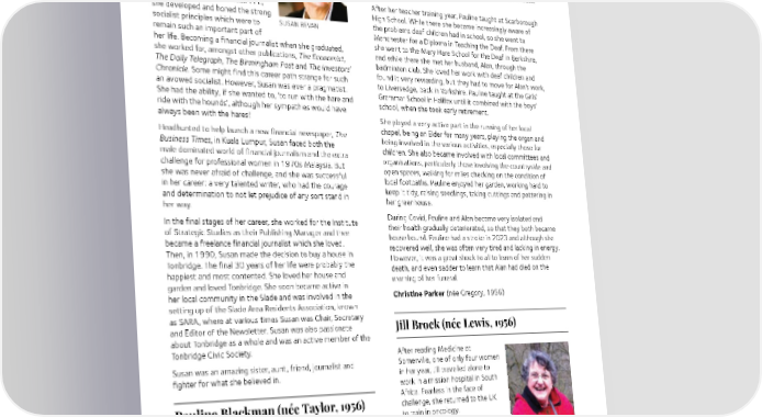 Pauline went on to study Mathematics at Somerville, and I Susan Bevan (1960) first met her when Miss Cobb, our tutor, put us together for our tutorials with her and with Mrs Thomson, who lived up the Daughter of an RAF officer, Susan Woodstock Road, for which our bicycles were definitely useful. was born in Newcastle on Tyne, but We went on to study slightly different areas of Mathematics her early life took her to Malaysia and so it was not until our third year we really became firm and Germany, as well as staying with friends. We were partners in the University Badminton team, relatives and attending boarding and so played a lot together. We also went for long cycle schools. Her fierce independence rides when our work was proving too difficult and we needed was a product of this early life. a break. Moving to Somerville to read PPE, After her teacher training year, Pauline taught at Scarborough she developed and honed the strong High School. While there she became increasingly aware of socialist principles which were to SUSAN BEVAN the problems deaf children had in school, so she went to remain such an important part of Manchester for a Diploma in Teaching the Deaf. From there her life. Becoming a financial journalist when she graduated, she went to the Mary Hare School for the Deaf in Berkshire, she worked for, amongst other publications, The Economist, and while there she met her husband, Alan, through the The Daily Telegraph, The Birmingham Post and The Investors’ badminton club. She loved her work with deaf children and Chronicle. Some might find this career path strange for such found it very rewarding, but they had to move for Alan’s work, an avowed socialist. However, Susan was ever a pragmatist. to Liversedge, back in Yorkshire. Pauline taught at the Girls’ She had the ability, if she wanted to, ‘to run with the hare and Grammar School in Halifax until it combined with the boys’ ride with the hounds’, although her sympathies would have school, when she took early retirement. always been with the hares! She played a very active part in the running of her local Headhunted to help launch a new financial newspaper, The chapel, being an Elder for many years, playing the organ and Business Times, in Kuala Lumpur, Susan faced both the being involved in the various activities, especially those for male dominated world of financial journalism and the extra children. She also became involved with local committees and challenge for professional women in 1970s Malaysia. But organisations, particularly those involving the countryside and she was never afraid of challenge, and she was successful open spaces, walking for miles checking on the condition of in her career: a very talented writer, who had the courage local footpaths. Pauline enjoyed her garden, working hard to and determination to not let prejudice of any sort stand in keep it tidy, raising seedlings, taking cuttings and pottering in her way. her greenhouse. In the final stages of her career, she worked for the Institute During Covid, Pauline and Alan became very isolated and of Strategic Studies as their Publishing Manager and then their health gradually deteriorated, so that they both became became a freelance financial journalist which she loved. house bound. Pauline had a stroke in 2023 and although she Then, in 1990, Susan made the decision to buy a house in recovered well, she was often very tired and lacking in energy. Tonbridge. The final 30 years of her life were probably the However, it was a great shock to all to learn of her sudden happiest and most contented. She loved her house and death, and even sadder to learn that Alan had died on the garden and loved Tonbridge. She soon became active in morning of her funeral. her local community in the Slade and was involved in the Christine Parker (née Gregory, 1956) setting up of the Slade Area Residents Association, known as SARA, where at various times Susan was Chair, Secretary and Editor of the Newsletter. Susan was also passionate Jill Brock (née Lewis, 1956) about Tonbridge as a whole and was an active member of the Tonbridge Civic Society. After reading Medicine at Susan was an amazing sister, aunt, friend, journalist and Somerville, one of only four women fighter for what she believed in. in her year, Jill travelled alone to work in a mission hospital in South Africa. Fearless in the face of Pauline Blackman (née Taylor, 1956) challenge, she returned to the UK to train in oncology. Pauline was born in Steeton, That fearlessness was mixed with Yorkshire, on 19 November 1937: a dash of stubbornness, and a the only child of Horace, a woollen lot of loyalty and generosity. Her JILL BROCK merchant, and Sarah, a teacher. patients benefited from the latter Although an only child, she had as she freely gave her time and expertise. As a consultant many cousins living in Steeton, and oncologist at Clatterbridge Hospital and Alder Hey Hospital, going with her to the local primary Jill treated children with cancer, and was very good at it, as school. Her cousin, Thea, was even shown by the number of weddings she was invited to and the in the same class with her at the number of Christmas cards and gifts she received. She was PAULINE BLACKMAN senior school in Keighley. clinical tutor and programme director for many years, training a 38