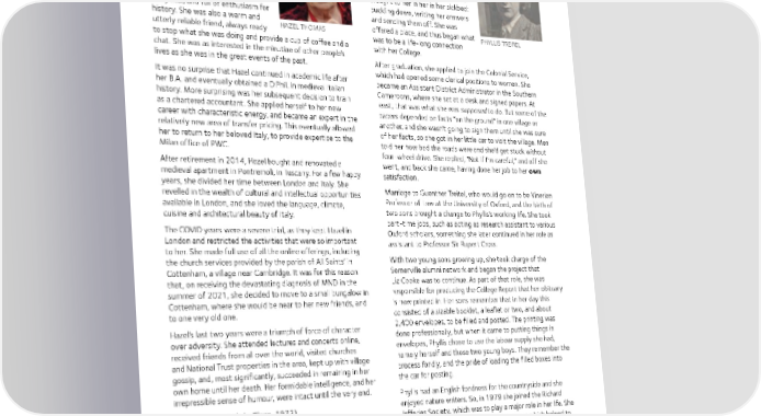 Hazel Thomas (1973) Phyllis Treitel (née Cook, 1948) Hazel and I met on our first day in Phyllis Cook might never have Somerville. We had both been given studied PPE at Somerville at all. rooms in West, which created an As the entrance exam loomed, she instant bond, as almost everyone came down with scarlet fever. Her else in the first year had been strength of will and determination housed in Vaughan. Hazel was an led her to have the exam questions impressive undergraduate: hard- brought to her in her in her sickbed: working, well-organized, fiercely buckling down, writing her answers analytical, and full of enthusiasm for and sending them off. She was history. She was also a warm and HAZEL THOMAS offered a place, and thus began what PHYLLIS TREIREL utterly reliable friend, always ready was to be a life-long connection to stop what she was doing and provide a cup of coffee and a with her College. chat. She was as interested in the minutiae of other people’s lives as she was in the great events of the past. After graduation, she applied to join the Colonial Service, It was no surprise that Hazel continued in academic life after which had opened some clerical positions to women. She her B.A. and eventually obtained a D.Phil. in medieval Italian became an Assistant District Administrator in the Southern history. More surprising was her subsequent decision to train Cameroons, where she sat at a desk and signed papers. At as a chartered accountant. She applied herself to her new least, that was what she was supposed to do. But some of the career with characteristic energy, and became an expert in the papers depended on facts “on the ground” in one village or relatively new area of transfer pricing. This eventually allowed another, and she wasn’t going to sign them until she was sure her to return to her beloved Italy, to provide expertise to the of her facts, so she got in her little car to visit the village. Men Milan office of PWC. told her how bad the roads were and she’d get stuck without four-wheel drive. She replied, “Not if I’m careful,” and off she After retirement in 2014, Hazel bought and renovated a went, and back she came, having done her job to her own medieval apartment in Pontremoli, in Tuscany. For a few happy satisfaction. years, she divided her time between London and Italy. She Marriage to Guenther Treitel, who would go on to be Vinerian revelled in the wealth of cultural and intellectual opportunities available in London, and she loved the language, climate, Professor of Law at the University of Oxford, and the birth of cuisine and architectural beauty of Italy. two sons brought a change to Phyllis’s working life. She took part-time jobs, such as acting as research assistant to various The COVID years were a severe trial, as they kept Hazel in Oxford scholars, something she later continued in her role as London and restricted the activities that were so important assistant to Professor Sir Rupert Cross. to her. She made full use of all the online offerings, including the church services provided by the parish of All Saints’ in With two young sons growing up, she took charge of the Cottenham, a village near Cambridge. It was for this reason Somerville alumni network and began the project that that, on receiving the devastating diagnosis of MND in the Liz Cooke was to continue. As part of that role, she was summer of 2021, she decided to move to a small bungalow in responsible for producing the College Report that her obituary Cottenham, where she would be near to her new friends, and is now printed in. Her sons remember that in her day this to one very old one. consisted of a sizable booklet, a leaflet or two, and about Hazel’s last two years were a triumph of force of character 2,400 envelopes, to be filled and posted. The printing was over adversity. She attended lectures and concerts online, done professionally, but when it came to putting things in received friends from all over the world, visited churches envelopes, Phyllis chose to use the labour supply she had, and National Trust properties in the area, kept up with village namely herself and those two young boys. They remember the gossip, and, most significantly, succeeded in remaining in her process fondly, and the pride of loading the filled boxes into own home until her death. Her formidable intelligence, and her the car for posting. irrepressible sense of humour, were intact until the very end. Phyllis had an English fondness for the countryside and she Frances Horgan (née Clegg, 1973) enjoyed nature writers. So, in 1979 she joined the Richard Jefferies Society, which was to play a major role in her life. She introduced the first RJS Journal of 32-pages which helped to make the Society more professional and scholarly: contributing to it over the years, transcribing Jefferies’ letters, and co- authoring the important chronology. Phyllis Treitel’s kindness, her wisdom, and her loyalty; her determination, her attention to detail and her wicked sense of humour are legendary. Though her final years were hampered by the growth of dementia, she is remembered with such fondness and gratitude by the College she did so much in her life to support. 58