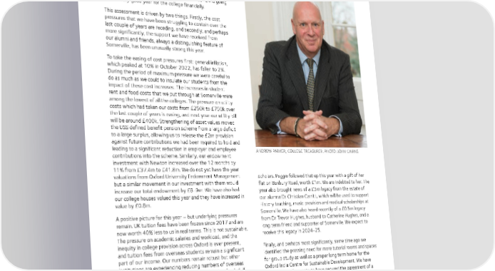 Treasurer’s Report At the time of writing, we are still some way away from having a final result for 2023-24 and we do not yet have confirmed valuations for our investments, but we do know enough to say with some confidence that 2023-24 is going to be a very good year for the college financially. This assessment is driven by two things. Firstly, the cost pressures that we have been struggling to contain over the last couple of years are receding, and secondly, and perhaps more significantly, the support we have received from our alumni and friends, always a distinguishing feature of Somerville, has been unusually strong this year. To take the easing of cost pressures first: general inflation, which peaked at 10% in October 2022, has fallen to 2%. During the period of maximum pressure we were careful to do as much as we could to insulate our students from the impact of these cost increases. The increases in student rent and food costs that we put through at Somerville were among the lowest of all the colleges. The pressure on utility costs which had taken our costs from £250k to £750k over the last couple of years is easing, and next year our utility bill will be around £400k. Strengthening of asset values moved the USS defined benefit pension scheme from a large deficit to a large surplus, allowing us to release the £2m provision against future contributions we had been required to hold and leading to a significant reduction in employer and employee ANDREW PARKER, COLLEGE TREASURER. PHOTO: JOHN CAIRNS contributions into the scheme. Similarly, our endowment investment with Newton increased over the 12 months by 11% from £37.4m to £41.8m. We do not yet have the year valuations from Oxford University Endowment Management scholars. Peggie followed that up this year with a gift of her but a similar movement in our investment with them would flat on Banbury Road, worth £1m. We are indebted to her. The increase our total endowment by £8-9m. We have also had year also brought news of a £3m legacy from the estate of our college houses valued this year and they have increased in our alumna Dr Christian Carritt, which will be used to support value by £0.8m. History teaching, music provision and medical scholarships at A positive picture for this year – but underlying pressures Somerville. We have also heard recently of a £0.5m legacy remain. UK tuition fees have been frozen since 2017 and are from Dr Trevor Hughes, husband to Catherine Hughes, and a now worth 40% less to us in real terms. This is not sustainable. long term friend and supporter of Somerville. We expect to The pressure on academic salaries and workload, and the receive this legacy in 2024-25. inequity in college provision across Oxford is ever present, Finally, and perhaps most significantly, some time ago we and tuition fees from overseas students remain a significant identified the pressing need for more tutorial rooms and spaces part of our income. Our numbers remain robust but other for group study as well as a proper long term home for the institutions are experiencing reducing numbers of overseas Oxford India Centre for Sustainable Development. We have students. We also face very major costs, as yet unfunded, if we are to move our college buildings to a net carbon position recently been fortunate to have secured the agreement of a by 2040. major donor which will enable us to fulfil this aspiration and we hope to be able to make an official announcement about this This has been an exceptional year in terms of the support we very soon. have had from alumni and friends. Last financial year finished with a gift of £0.9m from Dr Peggie Rimmer to be used to ANDREW PARKER set up a sanctuary fund to support displaced academics and August 2024 13