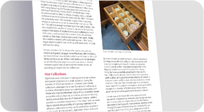 Library and Archives Report 2023-2024 Our Spaces Most of us remember our favourite place to study when we were at university and our favourite texts, and it is quite probable that Somerville’s current students will have similar recollections in the future. What is becoming apparent is that the way in which students learn and study is changing and so those recollections might be quite different to ours. Today’s student is as likely to study in a shared space as in their room, with many favouring the focused peace and motivational setting of the library. During 2023-24 the library altered its environment to adapt to these changing needs, and will continue to do so as space and funds permit. With 104 seats for potentially over 700 students, space in the library was always at a premium, so we increased that number by 13% to 118: still not enough but heading in the right direction. We also doubled the number of group study rooms (to two!) to support the desire of students to study in collaboration with their peers, and increased the number of individual study carrels so that they could as easily avoid their peers. Finally, we created a relaxed café-style seating area in the library loggia where students can catch up with each other, or study without formality. To help members of the Somerville community, and our MARY SOMERVILLE'S SHELL COLLECTION visitors and guests, engage more effectively with the library, we launched our new website, which can be found at https:// library.some.ox.ac.uk. While it will continue to be developed Another collection to which we have turned our attention is as we identify new ways to support our users, it already the Mary Somerville Shell Collection. We received the shell contains a good deal of practical information as well as collection complete with beautiful cabinet as a donation providing an insight into our collections. in 2017, and since then it has been situated either in the Mary Somerville Room or the Principal’s office. During Our Collections Trinity Term we successfully advertised for the role of a Shell Collection Cataloguer, and the collection is now being Significant work continues in making available our archives carefully listed, photographed and described by Will Adams, a and special collections to a wider audience. During the Glasgow University MA student, who has worked on a similar summer of 2023 we moved our artworks and chattels collection in the past. Over the next year or so, we hope to collections catalogue into a new format which will allow us reveal more of this collection to the public, as it is a wonderful to share information about our collections more easily with example of a collection of British natural history objects those who may be interested. Many of our collections remain assembled by a knowledgeable and enthusiastic collector. accessible only as physical, print items, and we are working hard to ensure that records of these are made as useful as It is not unusual for Somerville to be approached with possible to potential researchers. In the longer term we would requests for the loan of our artworks, and this year we have like to explore the possibility of digitising materials in the lent from our collection Patrick Heron’s The Red Table to different collections so they can be viewed from anywhere Charleston in East Sussex for their exhibition Matthew Smith: in the world. At the moment, digitisation of our collections Through the eyes of Patrick Heron. Our artworks form an happens only upon request. important part of our history as a college and, as with all our special collections, we afford them the care they need We reached a significant milestone in the Mill Marginalia to preserve them for future generations. This year we have Online project, which provides a digital edition of all conserved The Devil Sowing Tares, attributed to Abraham marks and annotations in the books of the John Stuart Bloemaert, and a portrait of Mary Somerville by a little- Mill Collection. We completed the scanning for marginalia known artist, Ubaldo Albanesi. of volumes in the collection, thanks to the efforts of our enthusiastic volunteer, Emma Sherratt (Modern Languages, As ever, we note our gratitude to our alumni who continue 1991). Professor Albert Pionke, Project Director, visited in to be unstintingly generous in their gifts to the library March 2024 to photograph the remaining marginalia, and and archives. Of the 1,625 items we added to the library these will be added to the online collection in the near future. collection, 221 were gifts, many publications donated by their 20
