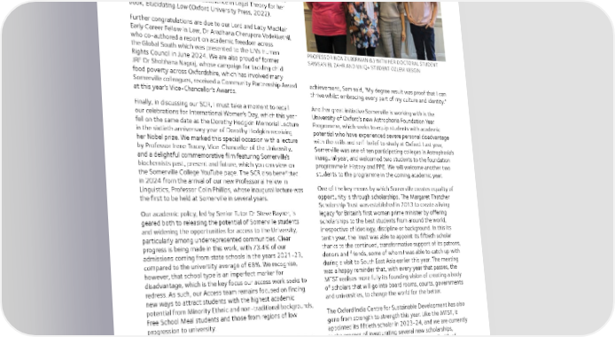 Our academics continue to receive recognition for their research. In the King’s Birthday Honours, our Senior Research Fellow Professor Rajesh Thakker was made an OBE for services to Medical Science and to People with Hereditary and Rare Disorders. Two of Somerville’s Senior Research Fellows, Professor Sir Marc Feldmann and Professor Tony Bell, received Royal Society medals in recognition of their contributions to the fields of immunology and high energy astrophysics, respectively. Professor Julie Dickson, meanwhile, was awarded the Alice Tay Book Prize for Excellence in Legal Theory for her book, Elucidating Law (Oxford University Press, 2022). Further congratulations are due to our Lord and Lady MacNair Early Career Fellow in Law, Dr Aradhana Cherupara Vadekkethil, who co-authored a report on academic freedom across the Global South which was presented to the UN’s Human PROFESSOR NOA ZILBERMAN (L) WITH HER DOCTORAL STUDENT Rights Council in June 2024. We are also proud of former SAWSAN EL ZAHR AND UNIQ+ STUDENT OZLEM KESGIN JRF Dr Shobhana Nagraj, whose campaign for tackling child food poverty across Oxfordshire, which has involved many Somerville colleagues, received a Community Partnership Award achievement, Sam said, "My degree result was proof that I can at this year’s Vice-Chancellor’s Awards. thrive whilst embracing every part of my culture and identity.” Finally, in discussing our SCR, I must take a moment to recall Another great initiative Somerville is working with is the our celebrations for International Women’s Day, which this year University of Oxford’s new Astrophoria Foundation Year fell on the same date as the Dorothy Hodgkin Memorial Lecture Programme, which seeks to equip students with academic in the sixtieth anniversary year of Dorothy Hodgkin receiving potential who have experienced severe personal disadvantage her Nobel prize. We marked this special occasion with a lecture with the skills and self-belief to study at Oxford. Last year, by Professor Irene Tracey, Vice-Chancellor of the University, Somerville was one of ten participating colleges in Astrophoria’s and a delightful commemorative film featuring Somerville’s inaugural year, and welcomed two students to the foundation biochemists past, present and future, which you can view on programme in History and PPE. We will welcome another two the Somerville College YouTube page. The SCR also benefitted students to the programme in the coming academic year. in 2024 from the arrival of our new Professorial Fellow in Linguistics, Professor Colin Phillips, whose inaugural lecture was One of the key means by which Somerville creates equality of the first to be held at Somerville in several years. opportunity is through scholarships. The Margaret Thatcher Scholarship Trust was established in 2013 to create a living Our academic policy, led by Senior Tutor Dr Steve Rayner, is legacy for Britain’s first woman prime minister by offering geared both to releasing the potential of Somerville students scholarships to the best students from around the world, and widening the opportunities for access to the University, irrespective of ideology, discipline or background. In this its particularly among underrepresented communities. Clear tenth year, the Trust was able to appoint its fiftieth scholar progress is being made in this work, with 73.4% of our thanks to the continued, transformative support of its patrons, admissions coming from state schools in the years 2021-23, donors and friends, some of whom I was able to catch up with compared to the university average of 68%. We recognise, during a visit to South East Asia earlier this year. The meeting however, that school type is an imperfect marker for was a happy reminder that, with every year that passes, the disadvantage, which is the key focus our access work seeks to MTST realises more fully its founding vision of creating a body redress. As such, our Access team remains focused on finding of scholars that will go into board rooms, courts, governments new ways to attract students with the highest academic and universities, to change the world for the better. potential from Minority Ethnic and non-traditional backgrounds, Free School Meal students and those from regions of low The Oxford India Centre for Sustainable Development has also progression to university. gone from strength to strength this year. Like the MTST, it appointed its fiftieth scholar in 2023-24, and we are currently Among several new Access initiatives focused on these student in the process of inaugurating several new scholarships, groups is the introduction of open days events curated for including an exciting gift agreement with Amee Parikh of specific minority audiences, such as Young Carers and BAME Amansa Capital that will bring four new scholars into the students. These have provided a valuable addition to our OICSD. Alongside the exceptional research our OICSD scholars existing strategies, including our work with Somerville’s regional produce, these ever-expanding partnerships are a token of the link areas and partnerships with outreach organisations such enduring bond between Somerville and India. That connection as Target Oxbridge, which works with Black and mixed-race received a particularly joyful boost in December, when the students with Black heritage to increase their chances of Somerville College Choir embarked on a tour of India. I was getting into Oxford and Cambridge. This year, I am delighted to fortunate to watch (and hear!) as our Choir wowed audiences say, one of our Target Oxbridge students, Sam Ajakaiye (2020, in Delhi, Goa and Mumbai with recitals of traditional Christmas History and French), achieved a First. Speaking about his music alongside several workshops for local children’s charities. 11