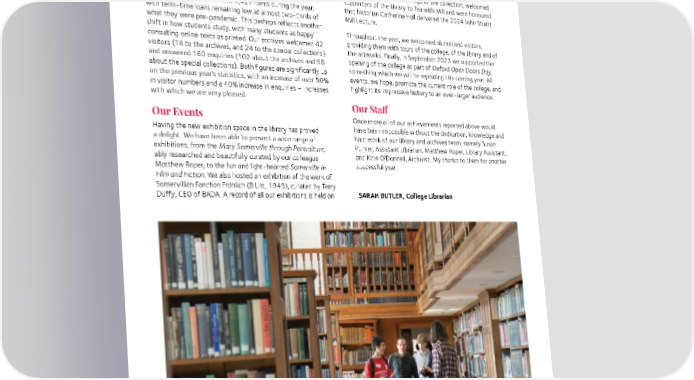Somervillian authors, and a significant donation of Classics our website, with many of the exhibitions reproduced fully texts from Jane Everson (Medieval and Modern Languages, in digital form. We also mounted several exhibitions outside 1974). We also received a donation of ceramics from Ann of the library in support of the many events hosted by the Squires (English, 1962) and a collection of the works of college, including a well-received exhibition about Dorothy Victor Hugo from Sarah Danby (Modern Languages, 1970), Hodgkin, when we celebrated the 60th anniversary of her both donated on the understanding they would raise funds for being awarded the Nobel Prize. the college. In our continued promotion of one of our most treasured In terms of usage of the various collections, we had 53 collections, the John Stuart Mill Library, we hosted several enquiries from external readers about material held in our open days and private viewings of the collection, welcomed library collection, of whom 24 visited the library in person to supporters of the library to Tea with Mill and were honoured consult material. We also lent 7,427 items during the year, that historian Catherine Hall delivered the 2024 John Stuart with term-time loans remaining low at almost two-thirds of Mill Lecture. what they were pre-pandemic. This perhaps reflects another shift in how students study, with many students as happy Throughout the year, we welcomed alumni and visitors, consulting online texts as printed. Our archives welcomed 42 providing them with tours of the college, of the library and of visitors (18 to the archives, and 24 to the special collections) the artworks. Finally, in September 2023 we supported the and answered 160 enquiries (102 about the archives and 58 opening of the college as part of Oxford Open Doors Day, about the special collections). Both figures are significantly up something which we will be repeating this coming year. All on the previous year’s statistics, with an increase of over 50% events, we hope, promote the current role of the college, and in visitor numbers and a 40% increase in enquiries – increases highlight its impressive history to an ever-larger audience. with which we are very pleased. Our Events Our Sta昀昀 Once more all of our achievements reported above would Having the new exhibition space in the library has proved have been impossible without the dedication, knowledge and a delight. We have been able to present a wide range of hard work of our library and archives team, namely Susan exhibitions, from the Mary Somerville through Portraiture, Purver, Assistant Librarian, Matthew Roper, Library Assistant, ably researched and beautifully curated by our colleague and Kate O’Donnell, Archivist. My thanks to them for another Matthew Roper, to the fun and light-hearted Somerville in successful year. Film and Fiction. We also hosted an exhibition of the work of Somervillian Fanchon Fröhlich (B Litt, 1949), curated by Terry Duffy, CEO of BADA. A record of all our exhibitions is held on SARAH BUTLER, College Librarian 21