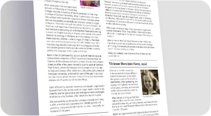 editing its journal. Back copies from that era do not credit her Helen Mawson (née Fuller, 1957) endeavours, but in 1955 she was listed as assistant editor. She had presumably been doing it all long before she got a mention After school at Haberdashers Askes on the back cover. where she was taught by Diana By this time, she had met Michael Nightingale, precocious Zvegintzov (née Lucas, 1926: Lit. secretary of the association (and nominal editor of the Hum.), Helen Mawson gained Open Museums Journal), while he was in the act of going through all Scholarships at both Oxford and the rubbish bins in the street looking for some mislaid papers. Cambridge. She chose Oxford and During this period the MA helped establish the Regional came to Somerville to read Greats Museum Service to give expert advice and assistance to small and retained great affection for the regional museums. Prior to its move to offices in the Adam- college throughout her life. designed 33 Fitzroy Street in the late 1950s, the association’s After graduation she was appointed HELEN MAWSOM address is listed as the ‘Meteorological Buildings’ in Exhibition lecturer in Philosophy at Fourah Bay Road (now the Dyson School of Design on the corner of College, now the University of Sierra Leone and at that time Exhibition Road and Imperial College Road). Later in life Hilary a college of Durham University. After 3 years there, she came recalled that when she left her office, she would walk through into contact with the British Council to whose overseas career the galleries of the Science Museum in the dark but with all the service she applied successfully and she was posted to Lagos models still whirring away. in Nigeria. There she met and married her husband, Stephen. At After a year working in Italy, Hilary returned to England and the time, marriage meant the end to her British Council career, married Michael in 1956. They settled in Wormshill in Kent, but she took a temporary job with the Ford Foundation writing where she brought up her family and managed 350 sheep on a report on English teaching in Nigeria, and thereafter followed the farm. Stephen to postings in Malaysia and India. During this time, Helen had two children – one during a 24-hour curfew from After all her children had flown the nest in the 1980s, she race riots and the second during the Indo-Pakistan war with trained as a conservation bookbinder at the London College trenches dug outside the house. With a colleague’s wife she of Printing. It is tempting to ponder what else she might have ran a kindergarten in Delhi and also went to Sanskrit classes, done if she was setting out today. adding that language to her Latin and Greek. Hilary was a dearly loved mother to five children and ten Back in the UK permanently, as soon as both children were at grandchildren. school Helen undertook a PGCE course and became Head of Classics at More House School in London. She wanted to teach Vivienne Rees (née Farey, 1951) Greek so after a few years moved to a similar post at Surbiton High School, where she enjoyed taking groups of girls on trips to Italy and Greece. After retirement, she continued to teach at A father in the RAF meant that the Open University, and lived for part of the year in a village Vivienne went to thirteen different on Lake Como where the west front of Como Cathedral bears schools before (with some relief) statues not of saints but of the two Plinys. she gained a place at Somerville to read History. After graduating, she Later afflicted by vascular dementia and macular degeneration married her husband and soulmate (a great trial to her as she could no longer read), she remained of 52 years, Jim Rees, and soon she cheerful and her personality and intelligence were unchanged. embarked on a teaching career at A fall led to a hip fracture, after which she died in hospital. Carlisle Grammar School. She successfully combined her scholarly interests with being After a break to bring up their two VIVIENNE REES a wife, a mother and a grandmother. Unfailingly kind and children, Alison and Bernard, Vivienne generous, many people will miss her acutely – especially her returned to teaching, as History teacher, and Head of Sixth husband of 56 years. Form, at the Lakes School in Windermere. She was to work there for 25 years. Hilary Nightingale (née Jones, 1948) Retirement gave Vivienne the chance to direct her sense of social responsibility into local politics and community affairs. She was a Liberal Democrat District Councillor for South Born in Swansea, and brought up by Lakeland, which she only gave up aged 87, campaigning for her widowed mother, Hilary secured affordable housing and flood action. She was also a Parish a state scholarship to read English Councillor, chairman of the Grasmere Village Society until her at Somerville. She achieved a first death, and chair of the Village Hall Trust. She supported the (one of only five in her year group Wordsworth Trust and organised local events and exhibitions, of 300). as well as fundraising and improving facilities at the hall. After Oxford she went to work for Being chair of the Grasmere Players involved not only the Museums Association (MA), organisation, but acting and directing, and indulging her HILARY NIGHTINGALE lifelong love of Shakespeare. 51
