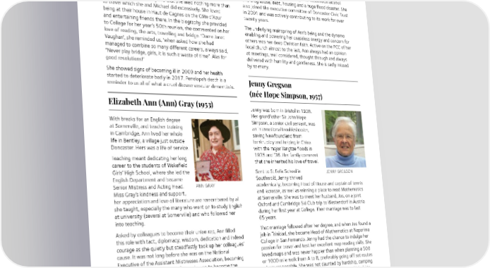 on the PCC for many years, as well as participating in many It came as little surprise to her colleagues and her students aspects of life in Elmdon. She served on the Parish Council and that, in view of her extraordinary ability, commitment and was ultimately elected Chairman. She was a reading assistant involvement, Ann was awarded the OBE for her services at Chrishall School and a Magistrate sitting first in Saffron to Education. Walden and then in Harlow and Chelmsford. Retiring from teaching, Ann and her sister took care of their She worked as PA to the Moore family at The Henry Moore elderly mother, but her life of public service was not over. Foundation, ran a successful small business and was active She was soon recruited onto the board of a local charity with several charities. A wonderful cook and hostess, someone memorably called BASH: Bentley Association for Supportive locally, without her knowledge, entered her for MasterChef Help. She became chair and sought to tackle local alcohol when it first started in 1990. The focus of her life were her and drug abuse, debt, housing and a huge flood disaster. She family and friends but beyond that she liked nothing more than also joined the executive committee of Doncaster Civic Trust to travel which she and Michael did extensively. She loved in 2001 and was actively contributing to its work for over being at their house in Haut de Cagnes on the Côte d’Azur twenty years. and entertaining friends there. In the biography she provided The underlying mainspring of Ann’s being and the dynamo to College for her year’s 50th reunion, she commented on her enabling and powering her ceaseless energy and concern for love of reading, the arts, travelling and bridge. ‘Dame Janet others was her deep Christian faith. Active on the PCC of her Vaughan’, she reminded us, ‘when asked how she had local church almost to the last, Ann always had an opinion managed to combine so many different careers, always said, at meetings, well considered, thought through and always “Never play bridge, girls, it is such a waste of time”. Alas for delivered with humility and gentleness. She is sadly missed good resolutions!’ by so many. She showed signs of becoming ill in 2009 and her health started to deteriorate badly in 2017. Penelope’s death is a Jenny Gregson reminder to us all of what a cruel disease vascular dementia is. (née Hope Simpson, 1957) Elizabeth Ann (Ann) Gray (1953) Jenny was born in Bristol in 1938. Her grandfather Sir John Hope With breaks for an English degree Simpson, a senior civil servant, was at Somerville, and teacher training an international troubleshooter, in Cambridge, Ann lived her whole saving Newfoundland from life in Bentley, a village just outside bankruptcy and helping in China Doncaster. Hers was a life of service. with the major Yangtze floods in Teaching meant dedicating her long 1935 and ‘36. Her family comment career to the students of Wakefield that she inherited his love of travel. Girls’ High School, where she led the Sent to St Felix School in JENNY GREGSON English Department and became Southwold, Jenny thrived Senior Mistress and Acting Head. ANN GRAY academically, becoming Head of House and captain of tennis Miss Gray’s kindness and support, and lacrosse, as well as winning a place to read Mathematics her appreciation and love of literature are remembered by all at Somerville. She was to meet her husband, Jos, on a joint she taught, especially the many who went on to study English Oxford and Cambridge Ski Club trip to Westendorf in Austria at university (several at Somerville) and who followed her during her first year at College. Their marriage was to last into teaching. 65 years. Asked by colleagues to become their union rep, Ann filled That marriage followed after her degree, and when Jos found a this role with tact, diplomacy, wisdom, dedication and indeed job in Trinidad, she became Head of Mathematics at Naparima courage as she quietly but steadfastly took up her colleagues’ College in San Fernando. Jenny had the chance to indulge her cause. It was not long before she was on the National passion for travel and test her excellent map reading skills. She Executive of the Assistant Mistresses Association, becoming loved maps and was never happier than when planning a 500 its last National President before going on to become the or 1000 mile walk from A to B, preferably going off set routes second National President of the now much larger joint wherever possible. She was not daunted by hardship, camping Assistant Masters and Mistresses Association, AMMA (later to out, travelling by truck from Bangkok to Beijing or Nairobi to become ATL.) In a large national and public role, Ann specialised Cape Town, or driving from Lima in Peru to Puerto Montt at in debates about curriculum and examination development the foot of Chile. and served on Government bodies monitoring the standards When Jos was posted to New Zealand, their first child, Dee, and comparability of the various exam boards. She clearly was born, followed eighteen months later by Helen. She needed to be prepared to dash from school down to London and Jos went on to run a stamp business together, and she to attend the plethora of meetings and prepared she was; one used that love of travel again, to raise charitable funds for colleague recalls counting thirteen outfits for such forays in four favourite charities – the Parkinson’s Disease Society; the staff cloakroom. Macmillan (she and Jos walked the whole Macmillan Way as 45