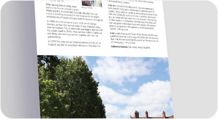 Mally Yates (née Shaw, 1949) family moved to Derbyshire, where Mally was to live for the rest of her life. Over the next 40 years, she led a busy and fulfilled life, supporting Tim in his ministry as well as developing Mally was born in Liverpool in her own interests. They both travelled widely, including to 1931 and attended Aigburth academic conferences which Tim was attending. They visited Vale Grammar School in the city New Haven for extended periods when he was researching before taking up a place to study at Yale Divinity School and made many friends there. Mally Mathematics at Somerville College. continued to use her knowledge of maths, tutoring children She looked back fondly on her who needed extra support during the 1980s. More recently time at Oxford and kept in touch she enjoyed doing sudokus! with many of her contemporaries throughout her life. Mally also did a lot of voluntary work. She volunteered as a After leaving Oxford, Mally went MALLY YATES Samaritan for many years. She served on national Church of back to her former school to teach England clergy selection panels as well as being a trustee of the Maths and R.E. A committed Christian, she then took up Children’s Society for a period of time. In addition, she trained a post a travelling secretary for the Scripture Union which as a lay reader and then went on to be involved in the training involved a lot of travel visiting schools in the north of England. of other readers in Derbyshire. She had many friendships and was very good at keeping in touch with people. She became In 1966 she then accepted a post at St John’s College, adept at using zoom in the pandemic, which lessened the Durham, as their first woman tutor. It was there that Mally isolation of living alone. met her husband Tim, to whom she was happily married until his sudden death in 2016. They had two children, Catherine Mally would often say at the end of her life that she felt very and Mark, who both survive her, together with her five grateful to have had such a long and fulfilled life. She was very grandchildren. clear that the service held at the end of her life was to be one In 1979 Tim, who was an ordained priest in the Church of of thanksgiving – which it was. England, decided to move back into parish life and so the Catherine Stanton (née Yates), Mally’s daughter