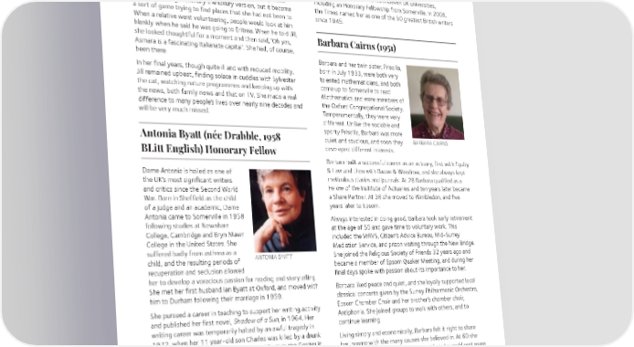 whole cohort of young oncologists, and was a senior examiner the Commonwealth Writers Prize (Eurasia region); the Premio for the Diploma in Medical Radiotherapy. She also freely Malaparte (Italy); the Shakespeare Prize (Germany); the gave her time as the founding medical director of the Wirral Erasmus Prize (Netherlands); the Park Kyong-ni Prize (South Hospice St John’s, for twelve years from 1983. She was fondly Korea); the Golden Plate Award of the American Academy remembered in Clatterbridge where she lived, even seventeen of Achievement; and the Hans Christian Andersen Literature years after her final retirement. Award (Denmark). After meeting her husband, Laurie, while in a full body-cast She was appointed CBE in the 1990 New Year Honours, and after back surgery, Jill went on to have three daughters. Even DBE for ‘Services to literature’ in the 1999 Birthday Honours. after Laurie’s death in 1996, her joy was cooking for her family She also received honours from eleven UK universities, and she had a passion for travel, and exploring new places: including an Honorary Fellowship from Somerville. In 2008, not backpacking, definitely the luxury version, but it became the Times named her as one of the 50 greatest British writers a sort of game trying to find places that she had not been to. since 1945. When a relative went volunteering, people would look at him blankly when he said he was going to Eritrea. When he told Jill, Barbara Cairns (1951) she looked thoughtful for a moment and then said, ‘Oh yes, Asmara is a fascinating Italianate capital’. She had, of course, been there. Barbara and her twin sister, Priscilla, In her final years, though quite ill and with reduced mobility, born in July 1933, were both very Jill remained upbeat, finding solace in cuddles with Sylvester talented mathematicians, and both the cat, watching nature programmes and keeping up with came up to Somerville to read the news, both family news and that on TV. She made a real Mathematics and were members of difference to many people’s lives over nearly nine decades and the Oxford Congregational Society. will be very much missed. Temperamentally, they were very different. Unlike the sociable and sporty Priscilla, Barbara was more Antonia Byatt (née Drabble, 1958 quiet and studious, and soon they BARBARA CAIRNS BLitt English) Honorary Fellow developed different interests. Barbara built a successful career as an actuary, first with Equity Dame Antonia is hailed as one of & Law and then with Bacon & Woodrow, and she always kept the UK’s most significant writers meticulous diaries and journals. At 28 Barbara qualified as a and critics since the Second World Fellow of the Institute of Actuaries and ten years later became War. Born in Sheffield as the child a Share Partner. At 38 she moved to Wimbledon, and five of a judge and an academic, Dame years later to Epsom. Antonia came to Somerville in 1958 Always interested in doing good, Barbara took early retirement following studies at Newnham at the age of 55 and gave time to voluntary work. This College, Cambridge and Bryn Mawr included the WRVS, Citizen’s Advice Bureau, Mid-Surrey College in the United States. She Mediation Service, and prison visiting through the New Bridge. suffered badly from asthma as a ANTONIA BYATT She joined the Religious Society of Friends 32 years ago and child, and the resulting periods of became a member of Epsom Quaker Meeting, and during her recuperation and seclusion allowed final days spoke with passion about its importance to her. her to develop a voracious passion for reading and storytelling. She met her first husband Ian Byatt at Oxford, and moved with Barbara liked peace and quiet, and she loyally supported local him to Durham following their marriage in 1959. classical concerts given by the Surrey Philharmonic Orchestra, She pursued a career in teaching to support her writing activity Epsom Chamber Choir and her brother’s chamber choir, and published her first novel, Shadow of a Sun, in 1964. Her Antiphonia. She joined groups to walk with others, and to writing career was temporarily halted by an awful tragedy in continue learning. 1972, when her 11 year-old son Charles was killed by a drunk Living simply and economically, Barbara felt it right to share driver. She recovered and published The Virgin in the Garden in her income with the many causes she believed in. At 60 she 1978. The book’s success allowed her to retire from teaching bought a former vicarage in Epsom so that she could rent spare in 1983 to work as a full-time writer. rooms to needy tenants. Although a naturally shy person, when Dame Antonia won many plaudits for her work, which spanned she chose a charity to support, she often got actively involved. ten novels, six short story collections, four novellas, nine Her favourite causes included Age Concern, Boom Credit critical studies, and five edited volumes. Her 1990 novel Union, the Campaign for Nuclear Disarmament, Greenpeace, Possession: A Romance was awarded the prestigious Booker the housing charity Hope Into Action and the Epsom & Ewell Prize for Fiction, and her 2009 work The Children’s Book was Refugee Network. In her mid-80s she was still going into also nominated for the award, as well as winning the James London for the Quaker Yearly Meeting or for demonstrations. Tait Black Memorial Prize. Her writing also won international She focused, as have so many Somervillians, on making life recognition, including the Irish Times International Fiction Prize; better for those around her. 39