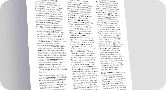 The International Association for the research. The programme received key Mathematics Philosophy of Law and Social Philosophy support from Maryland PhD students awarded her the Alice Tay Book Prize for in Colin’s team who spent a chunk of In 2023-24, Dan Ciubotaru has Excellence in Legal Theory for her book, the summer in Oxford, helping to train continued his research in representation Elucidating Law (Oxford University and mentor Oxford students. Another theory, partially funded by an EPSRC Press, 2022). The prize was awarded at research highlight was Colin’s inaugural New Horizons grant. He published the World Congress of the Philosophy of lecture (‘Now you say it, now you three papers: ‘A nonabelian Fourier Law in Seoul in July 2024. don’t’), held at Somerville in early June, transform for tempered unipotent which brought together themes — representations’, with A.-M. Aubert and and brought together people — from B. Romano, to appear in Compositio Linguistics throughout his career. In the past Math; ‘The wavefront sets of unipotent Louise Mycock has continued her year Colin held a couple of notable supercuspidal representations’, with L. activities with the international research-related roles. He is continuing Mason-Brown and E. Okada, twenty network Syntax Beyond the Canon, as editor of the journal Annual Review pages, to appear in Algebra and Number contributing a chapter titled '"Tis goodly of Linguistics, part of the prestigious Theory; and ‘Some unipotent Arthur language this, what would it mean?" Annual Reviews family of journals. In packets for reductive p-adic groups’, with Demonstrative ProTags in the History spring 2024 he completed his term L. Mason-Brown and E. Okada, to appear of English', written with Sharon Glaas as Chair of the Linguistics & Language in IMRN. He has also submitted four (University of Birmingham) to the edited Science section of the American more preprints (arXiv) for publication. volume Non-Canonical English Syntax: Association for the Advancement of Dan’s former postdoc and collaborator, Concepts, Methods, and Approaches. Science. Colin will be taking on the role Lucas Mason-Brown, has secured a This volume, containing network of department head in the Faculty of highly competitive University Research members’ research, is scheduled to Linguistics, Philology, and Phonetics. Fellowship at Oxford and several tenure- be published by Cambridge University In this role, he is looking forward to track jobs in the UK and the US. He will Press in 2025. The research carried supporting the department’s move start as an assistant professor at UT out in collaboration with UNIQ+ interns into the new Schwarzman Centre for Austin in July 2024. One of Dan’s DPhil Dylan Ryder and Dan Street in 2023 the Humanities, right next door to students graduated in August 2023 has been written up. Louise’s paper, Somerville, which will create many new and he is now a postdoc in Hong Kong. co-authored with Sharon Glaas, titled opportunities for research. In October, Dan is currently supervising three DPhil ‘The Demonstrative ProTag Construction Colin gave three talks in Korea, including students, including one jointly with a in Social Interaction: a Historical as a keynote speaker at the Applied colleague at University of Padova. He has Perspective’ is currently under review. Linguistics Association of Korea. In supervised four master’s dissertations Louise also gave a presentation of her January he and his students gave a talk this year, and one of these students research on ‘meaningless’ pronouns to at the Linguistic Society of America will start a funded PhD in Germany. school students who attended a training in New York City about their research Dan has reported on his research session for the UK Linguistics Olympiad carried out on the museum floor at results at conferences in Hong Kong, this year. Over the summer she is Planet Word Museum in Washington DC. Manchester, Bath, Cluj-Napoca, and York. working on her monograph on ‘wh’- They also spoke about another arm of Unfortunately, he is at the point in his questions and investigating discourse this research at the LingO conference career where his administrative burden markers and their development in in Oxford in June. In May, Colin was seems to be increasing exponentially, spoken and written language further. involved in four presentations at the so he can only hope that he’ll be able to She has also participated in the College Human Sentence Processing Conference continue his research programme at the Open Days. at the University of Michigan, Ann Arbor, same rate in the near future. This was an important transitional USA. A highlight of this was his talk Renaud Lambiotte often jokes that his year for Colin Phillips, as he shifted ‘Janet Dean’s Path to Psycholinguistics’, current research interests are those of from directing a research centre that based around findings in Somerville his DPhil students. The last academic spans 15 departments within one College’s archives about alumna Janet year was difficult in many ways, but also university, to building a research team Dean Fodor, one of the world’s leading very successful for his students, hence that spans two continents. It has psycholinguists, and a mentor of his, indirectly for him. At the end of last worked well so far, with increasing who passed away in late 2023. In March year, John Pougué-Biyong successfully cross-talk and collaboration between he gave a talk at an Oxford workshop defended his DPhil, and he is now Head the nodes in Oxford and Maryland. One about the link between linguistics and of Data at Kamoa, a startup in the field highlight of this is the new summer computer science, whilst last November, of microcredit in Africa, in a wonderful research internship programme that in the ‘now for something completely example of using data science for the Colin started in summer 2024, with differ