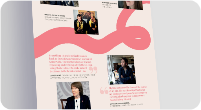 Somerville created a safe haven for my intellectual curiosity and for life-long friendships to flourish. I’m so glad I ended up there, in the nicest bit of Oxford. FARHANA YAMIN, CLIMATE CHANGE LAWYER FRANCES HARDINGE AUTHOR OF THE LIE TREE MARTIN DESMOND ROE OSCAR-WINNING DIRECTOR OF TWO DISTANT STRANGERS Everything I do scientifically comes back to those first principles I learned at Somerville. The methodology of testing, repeating and refining a hypothesis then using that evidence to make robust decisions is the heart of what I do. JUNE RAINE, CEO OF THE MHRA, (RESPONSIBLE FOR APPROVING THE UK’S COVID-19 VACCINES) My time at Somerville changed the course of my life. The relationships I built with my professors and peers helped shape my career (I also happened to make over a dozen lifelong friends). ANTHEMOS GEORGIADES, ENTREPRENEUR AND FOUNDER OF ZUMPER LEARN MORE ABOUT FAMOUS SOMERVILLIANS. SCAN HERE | 25